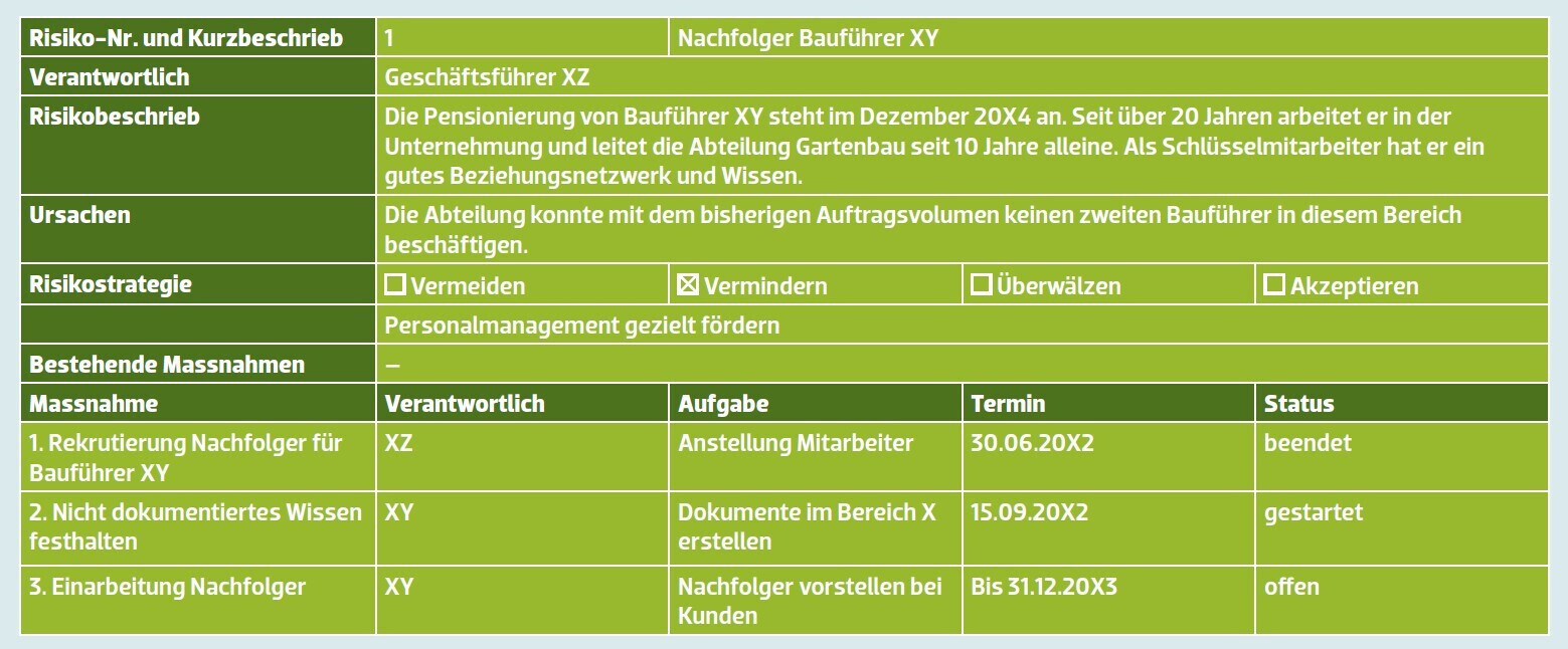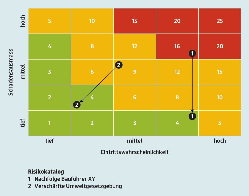 Der Umgang mit Risiken wird in einem Massnahmenplan mit Detailangaben ausgearbeitet. Die gewünschte Veränderung der Einstufung (Eintrittswahrscheinlichkeit und Schadenshöhe) wird wiederum auf der Risikomatrix eingetragen. Am Beispiel Nummer 1 auf der Risikomatrix heisst das, dass die Eintrittswahrscheinlichkeit und das Schadensausmass durch geeignete Massnahmen minimiert wurden.